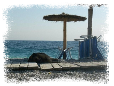In der Früh war unser Lager war mit Asche bedeckt. Wir ließen Orikum hinter uns und passierten den Llogara-Pass. Berg auf plagte sich unser Trabi, welcher zwischenzeitlich den liebevollen Namen Schorsch bekam, teilweise mit Schrittgeschwindigkeit. Berg ab fanden wir zum ersten Mal einen gewaltigen Nachteil an unserem Zweitakter. Da er keine Druckumlaufschmierung wie ein 4-Takter oder Diesel hatte, sondern durch das Benzin Öl Gemisch geschmiert wird, ist das Bremsen mit dem Motor über längere Strecken nicht sinnvoll. Man hätte gute Chancen für einen Kolbenreiber. Also Betriebsbremse. Da durch das Gewicht des Anhängers eine dementsprechende Schubkraft vorhanden war, lief uns ständig die Bremse heiß. Nach einigen Zwangspausen erreichten wir Dhermi, wo der Sonnenstich in der Bucht unter einem Sonnenschirm auskuriert wurde. Die Ruhe tat gut und so verbrachten wir gleich die Nacht an diesem schönen Ort.