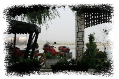 Durch waldige Mittelgebirgslandschaft zieht sich die Landstraße 14A nach Tarnaveni und weiter bis Medias. Dort biegen wir links ab und folgen der schmalen, aber landschaftlich wunderschönen Straße bis Sighisoara. In Sighisoara treffen wir wieder auf die E60. Ihr folgen wir wieder ein Stückchen weit bis Hoghiz. Von dort soll es dann über noch kleinere Straßen nach Sercaia gehen, doch ein mächtiges Unwetter macht uns einen gewaltigen Strich durch die Rechnung. In letzter Minute flüchten wir uns in eine Kneipe am Rande der E60. Draußen setzt Sintflutartiger Regen ein, ein mächtiges Gewitter zieht über uns hinweg. Die Wassermassen sind so gewaltig, dass sie durch Kneipentüre reinlaufen und der Wirt das Wasser abschöpfen muss. Ein in die Mitte des Lokals eingelassener Gully verrät jedoch, dass dies nicht zum ersten Mal geschieht.